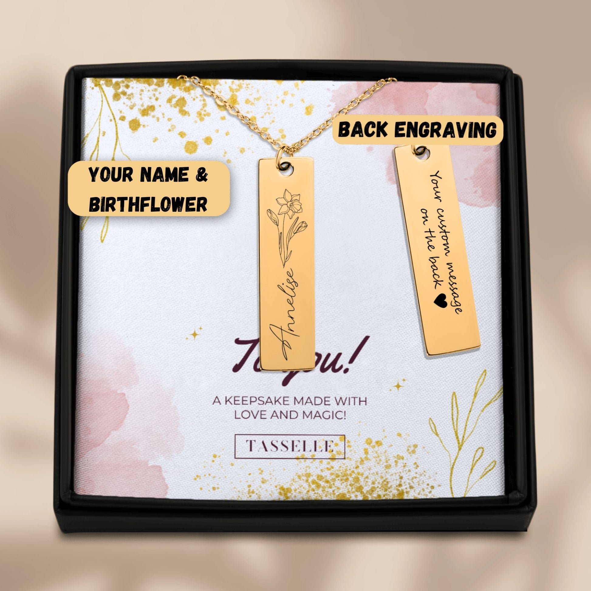 This necklace blends the symbolism of birthflowers with the simplicity of name engraving, creating a dreamy piece that carries both beauty and intention.