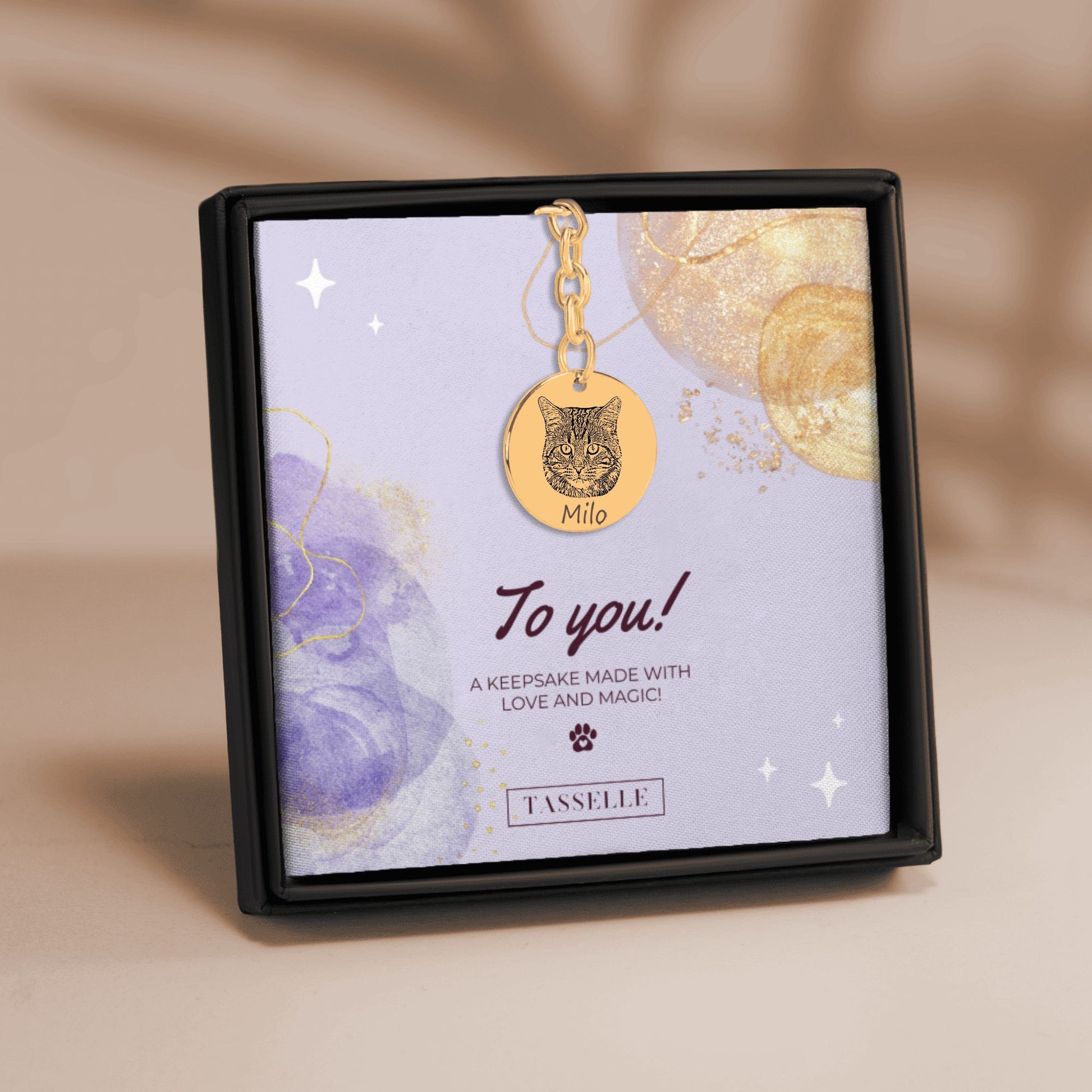 This double-sided portrait keychain lets you engrave one beloved pet on each side, creating a personal and meaningful accessory you can take with you everywhere.