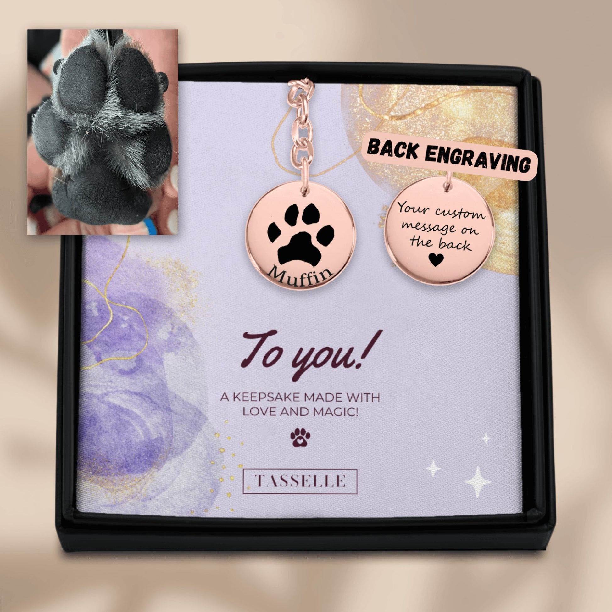 Engraved with a delicate paw symbol on a shining metal tag, it’s both durable and sentimental — the perfect small gift for pet parents, friends, or anyone who cherishes a little four-legged love.
